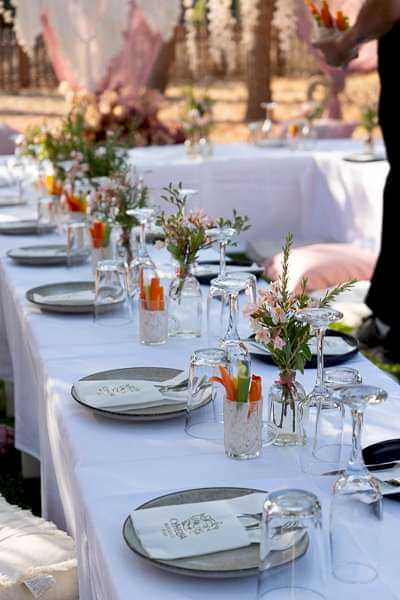 Fully decorated setup: tables, chairs, linens, pillows, centerpieces, styling